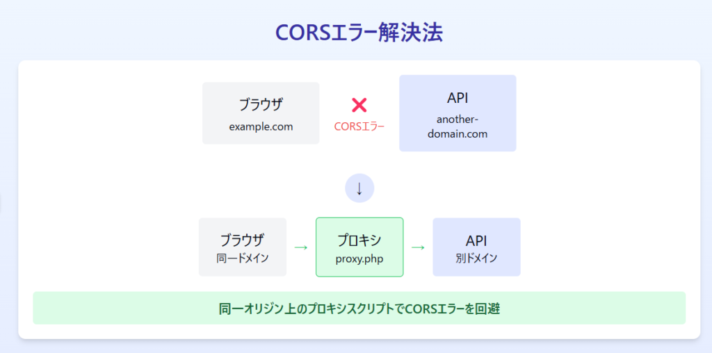 - クライアントサイド(JavaScript)は外部APIに直接アクセスする代わりに、同じドメイン上にあるプロキシスクリプトにリクエストを送信