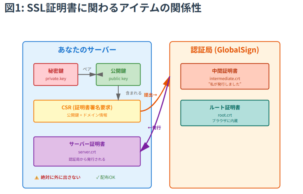 ポイント:秘密鍵はサーバー内にのみ保管し、CSRには公開鍵だけを含めて認証局に提出します。